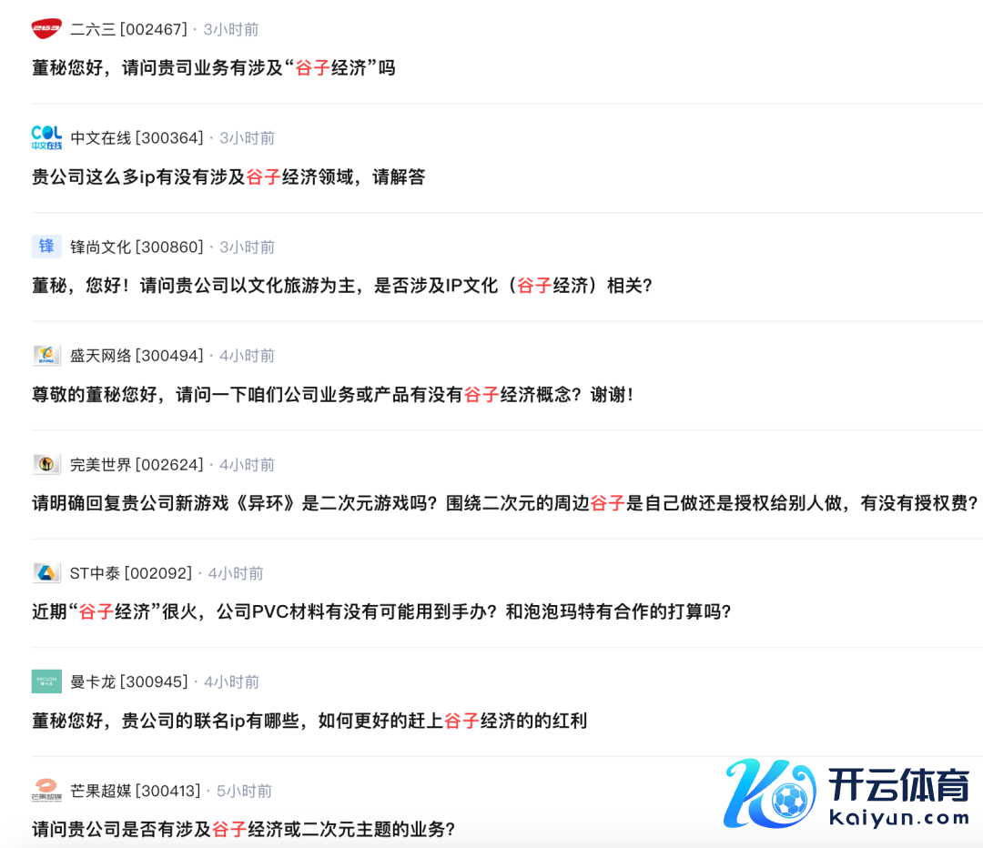 伴跟着多只“谷子经济”宗旨股大涨,券商发表挑升酌量施展,近期有多量上市公司被投资者商讨有莫得涉足“谷子经济”关系业务。本周两个往复日,部分上市公司因股价异动发布公告,也讲到了现在公司在动漫IP繁衍品等方面的布局。